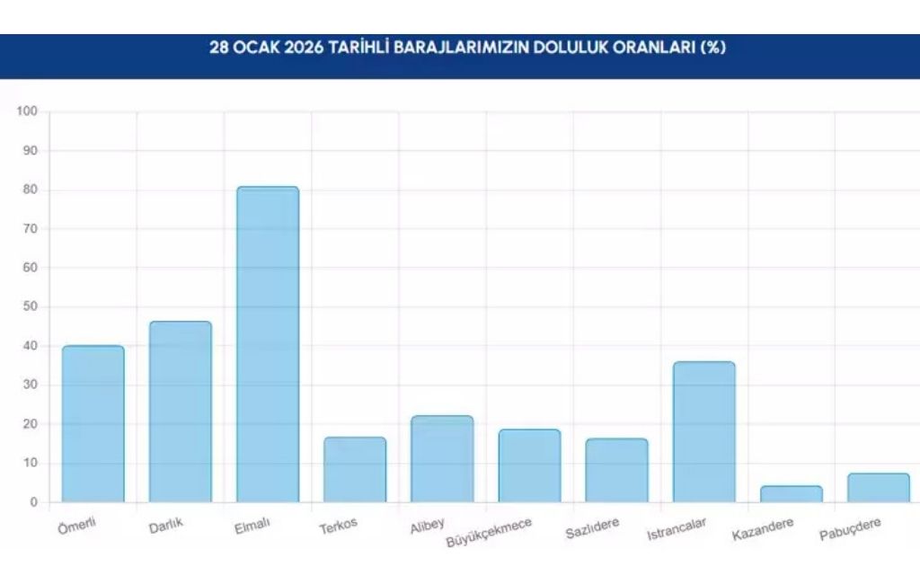 Bu oran, şehrin su ihtiyacını karşılayan Alibey, Büyükçekmece, Darlık, Elmalı, Istrancalar, Kazandere, Ömerli, Pabuçdere, Sazlıdere ve Terkos barajlarının tamamını kapsıyor.