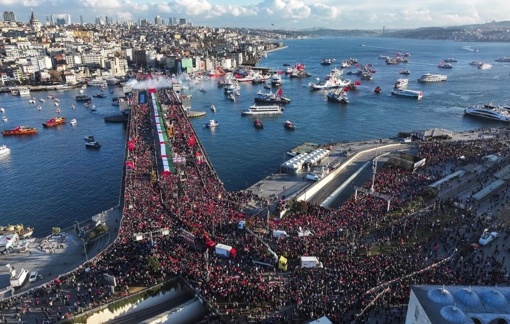 Türkiye Gençlik Vakfı (TÜGVA) öncülüğünde, İnsanlık İttifakı ve Milli İrade Platformu çatısı altında Filistin’e destek için Galata Köprüsü’nde yılın ilk gününde yürütüş düzenlendi.