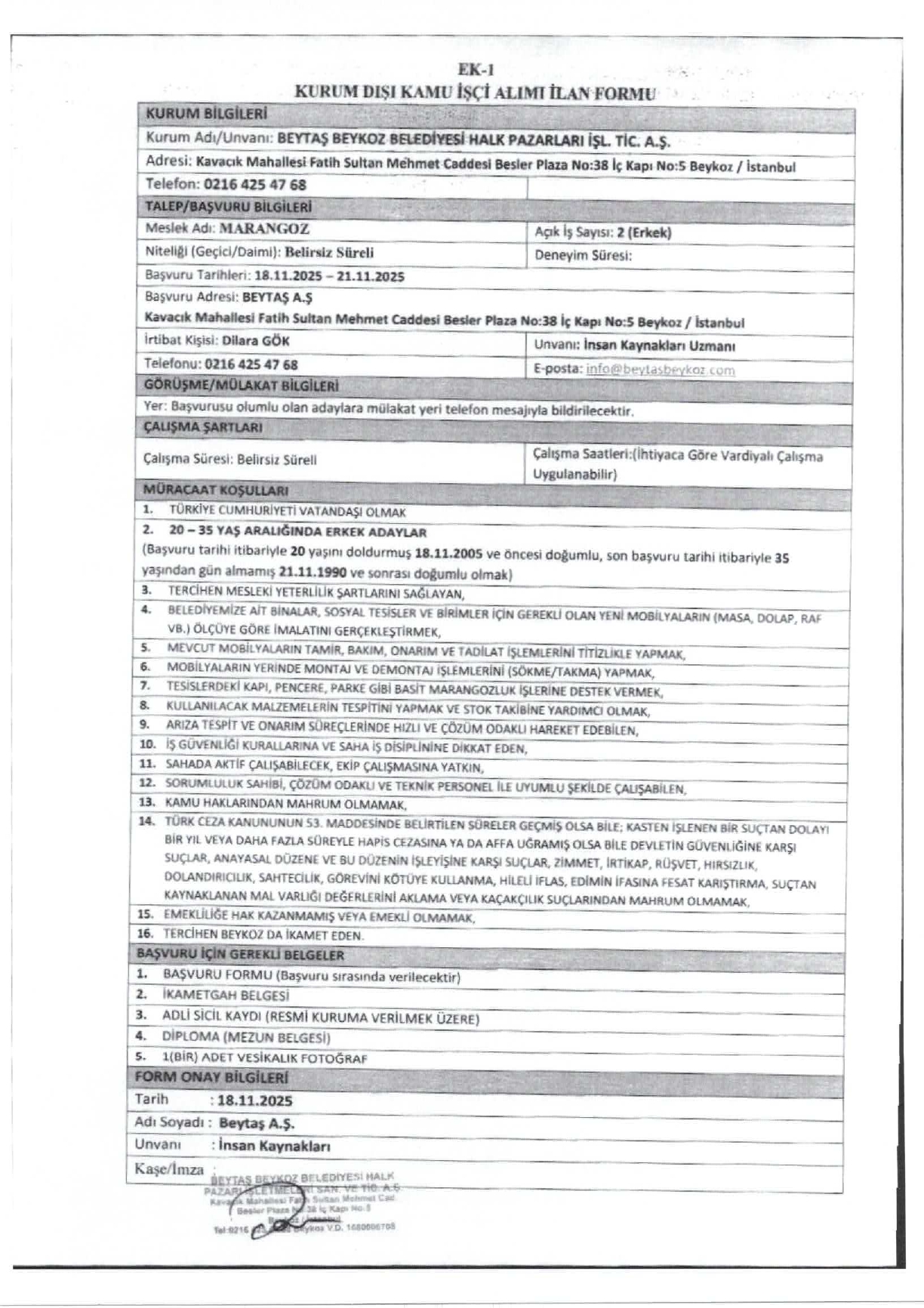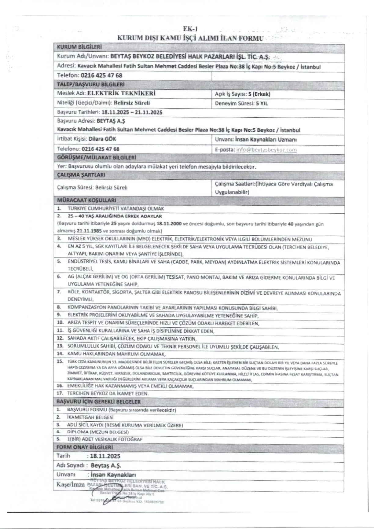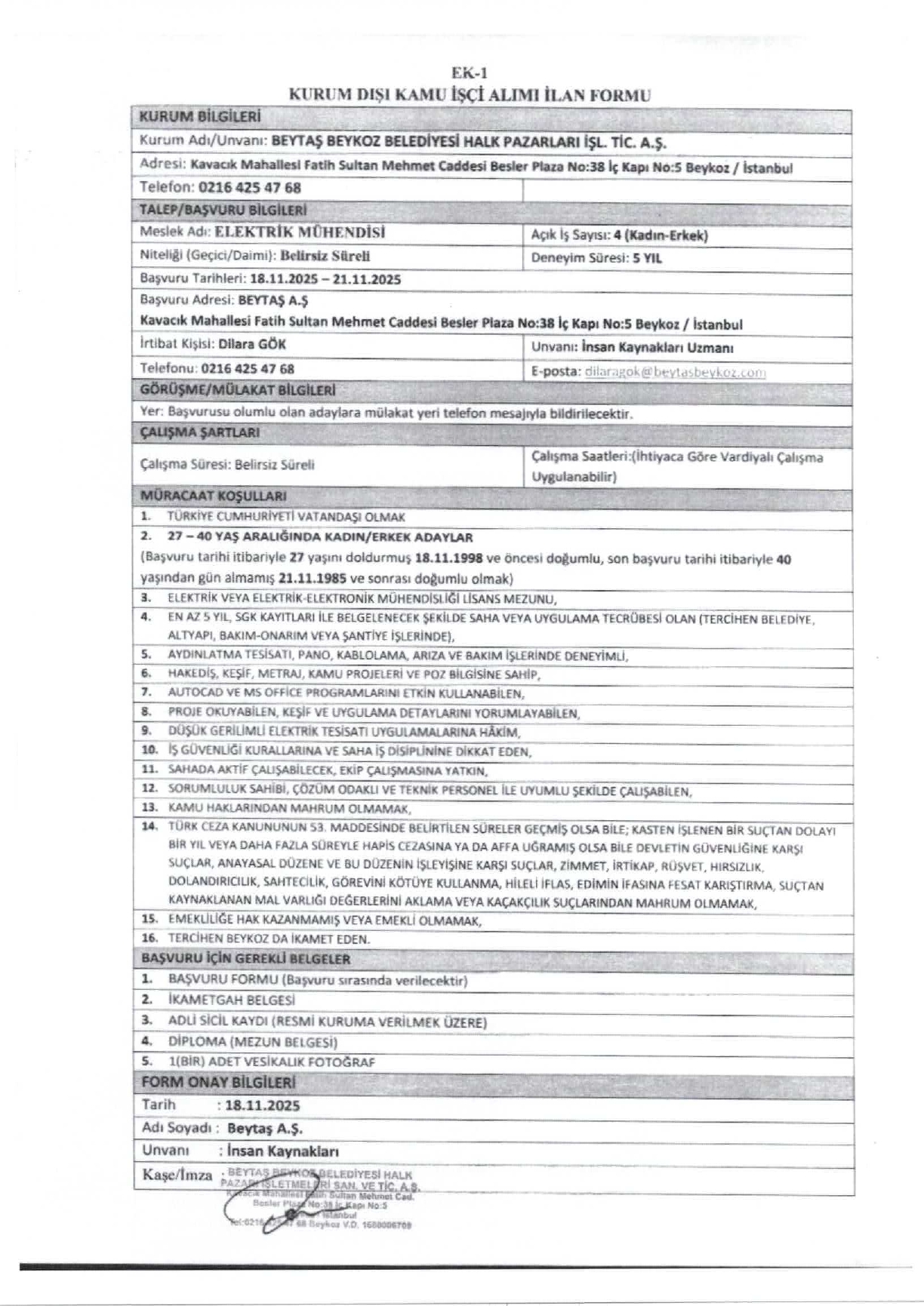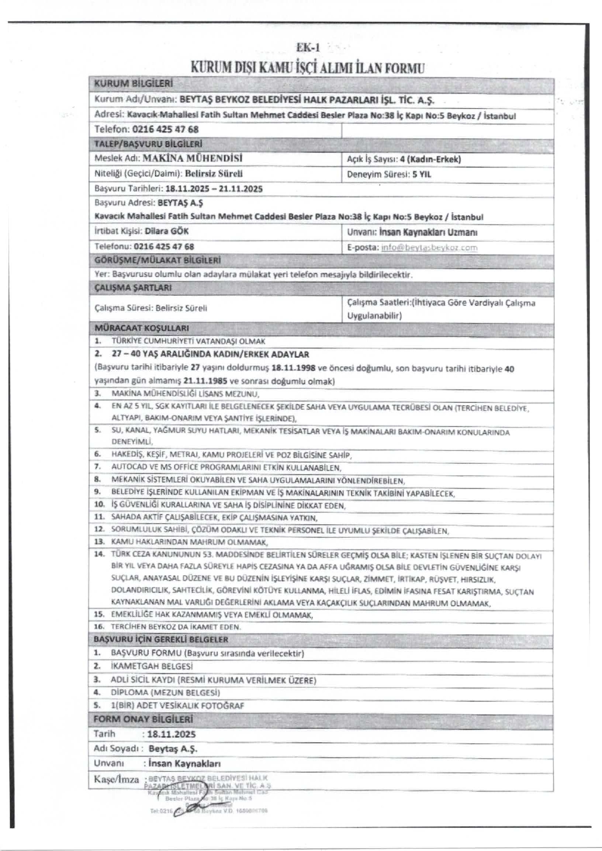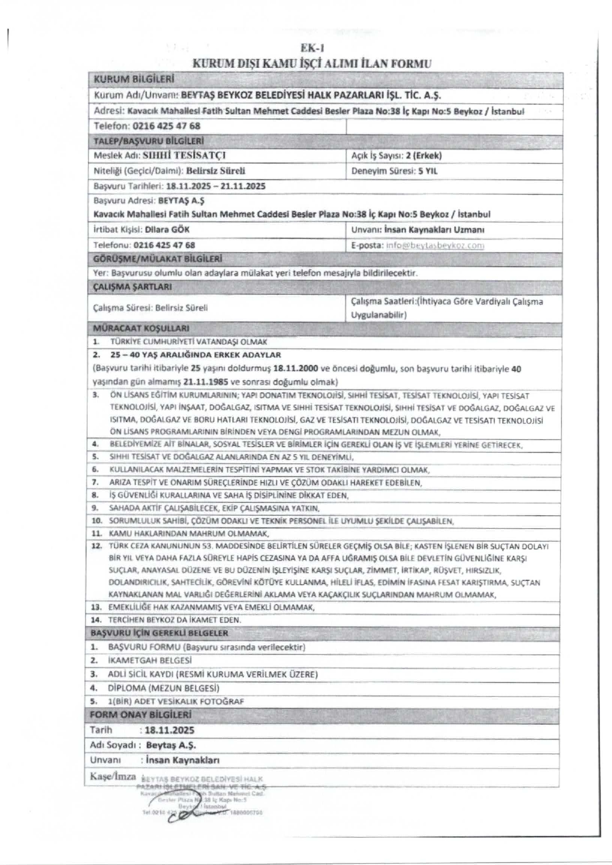 Başvurular, 21 Aralık 2025 tarihine kadar BEYTAŞ A.Ş Rüzgarlıbahçe Mahallesi Şehit Metin Kaya Sokak No: 79/3 adresine yapılacaktır.