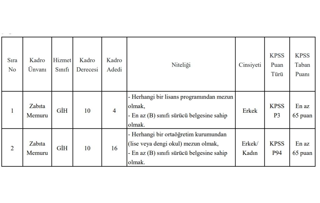 İstanbul ili Beykoz Belediye Başkanlığı bünyesinde, 657 sayılı Devlet Memurları Kanununa tabi olarak istihdam edilmek üzere; Belediye Zabıta Yönetmeliği hükümlerine göre aşağıda unvanı, sınıfı, derecesi, adedi, nitelikleri, KPSS puan türü, KPSS taban puanı ve diğer şartları taşımak kaydıyla belirtilen boş kadrolara açıktan atama yoluyla zabıta memuru alımı yapılacaktır.
