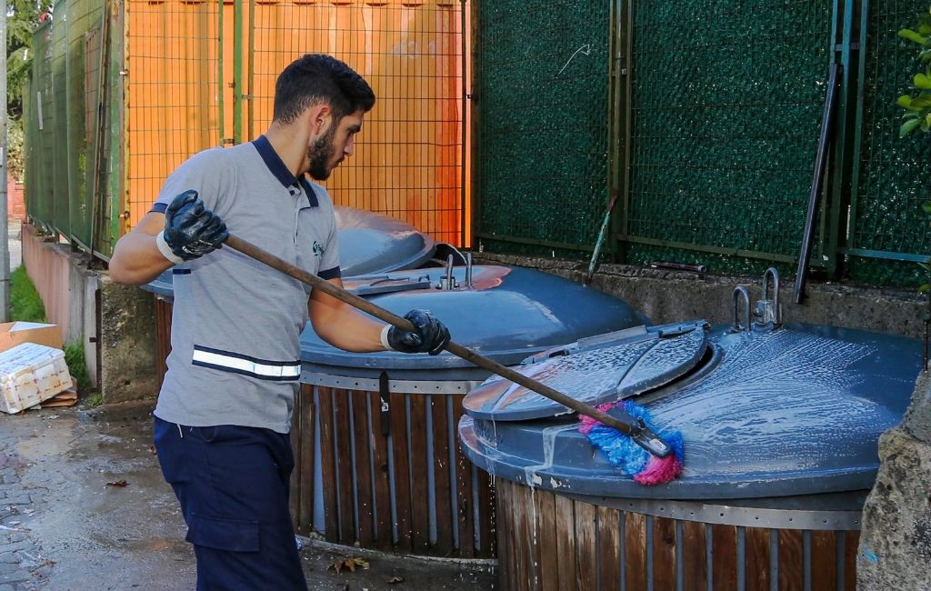 Mahalledeki atıkları toplayan ekipler konteynerleri köpüklü sularla yıkayarak hijyen sağladı.
