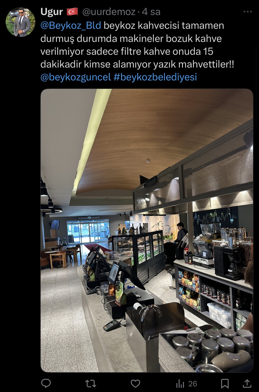 Bir vatandaşın Beykoz Güncel Haber’e gönderdiği şikayette, “Beykoz kahvecisi tamamen durmuş durumda. Makineler bozuk, kahve verilmiyor. Sadece filtre kahve, onu da 15 dakikadır kimse alamıyor.” ifadeleriyle tepkisini dile getirdi.