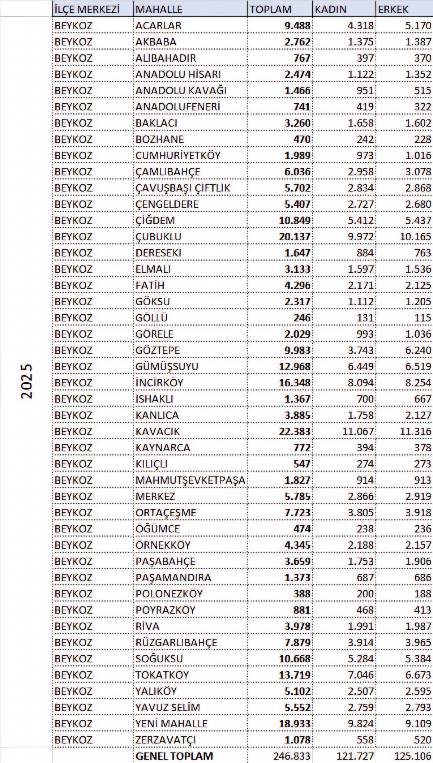 BEYKOZ’UN GÜNCEL NÜFUSU 246.833 OLARAK AÇIKLANDI
