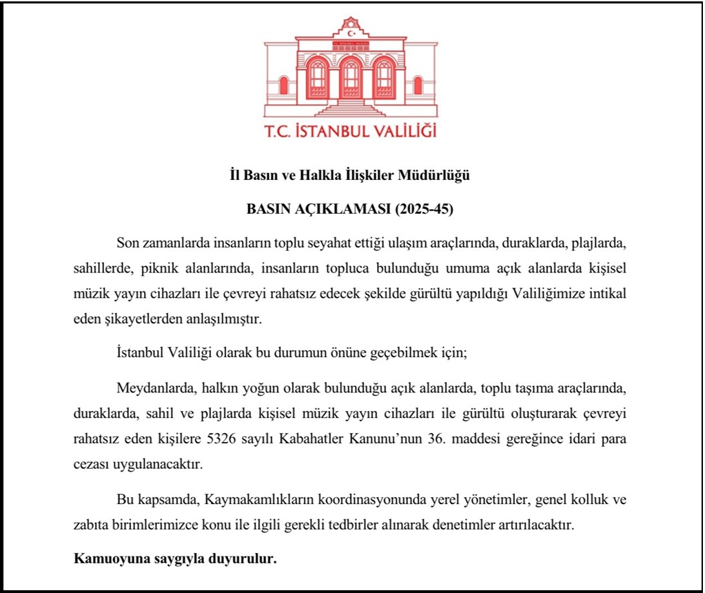 İstanbul Valiliği, son zamanlarda insanların toplu olarak bulunduğu ulaşım araçlarında, duraklarda, plajlarda, sahillerde ve piknik alanlarında artan yüksek sesli müzik şikâyetleri üzerine harekete geçti. Yapılan açıklamada, kişisel müzik yayın cihazlarıyla gürültü oluşturarak çevreyi rahatsız eden kişiler hakkında idari para cezası uygulanacağını bildirdi.