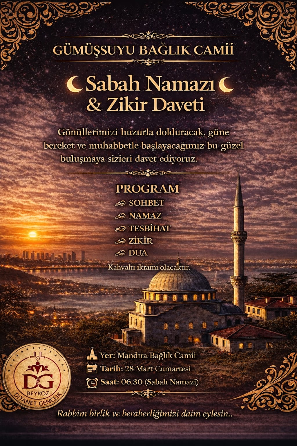 Beykoz Diyanet Gençlik koordinesinde, manevi atmosferi güçlendirecek anlamlı bir program düzenleniyor. Gümüşsuyu Bağlık Camii’nde gerçekleştirilecek “Sabah Namazı ve Zikir Daveti” ile vatandaşlar huzur dolu bir buluşmada bir araya gelecek.