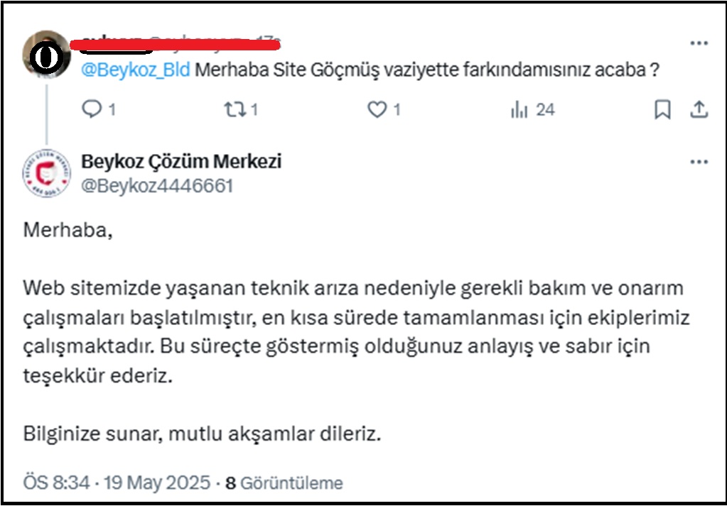 Beykoz Belediyesi’ne bağlı Beykoz Çözüm Merkezi ise gelen tepkiler üzerine yaptığı açıklamada, teknik bir arıza nedeniyle bakım ve onarım çalışmalarının başlatıldığını duyurdu. Çalışmaların ne zaman tamamlanacağına dair net bir tarih verilmezken, sürecin “en kısa sürede” çözüleceği belirtildi.