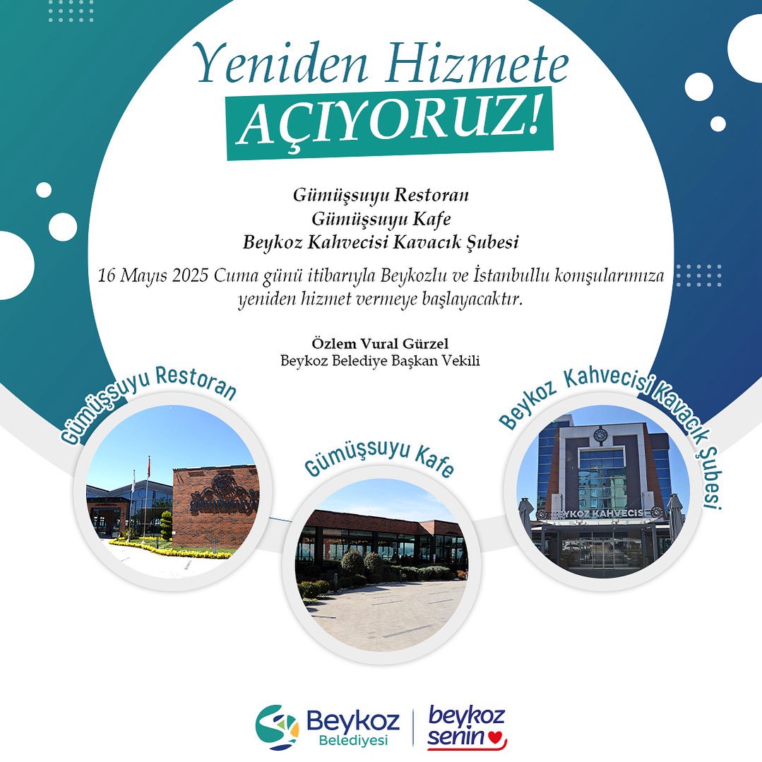 Gümüşsuyu Restoran, Gümüşsuyu Kafe ve Beykoz Kahvecisi Kavacık Şubesi, 16 Mayıs 2025 Cuma günü itibarıyla Beykozlulara ve İstanbullulara yeniden kapılarını açacak. Açılış duyurusu, Beykoz Belediye Başkan Vekili Özlem Vural Gürzel tarafından sosyal medya hesapları üzerinden paylaşıldı.
