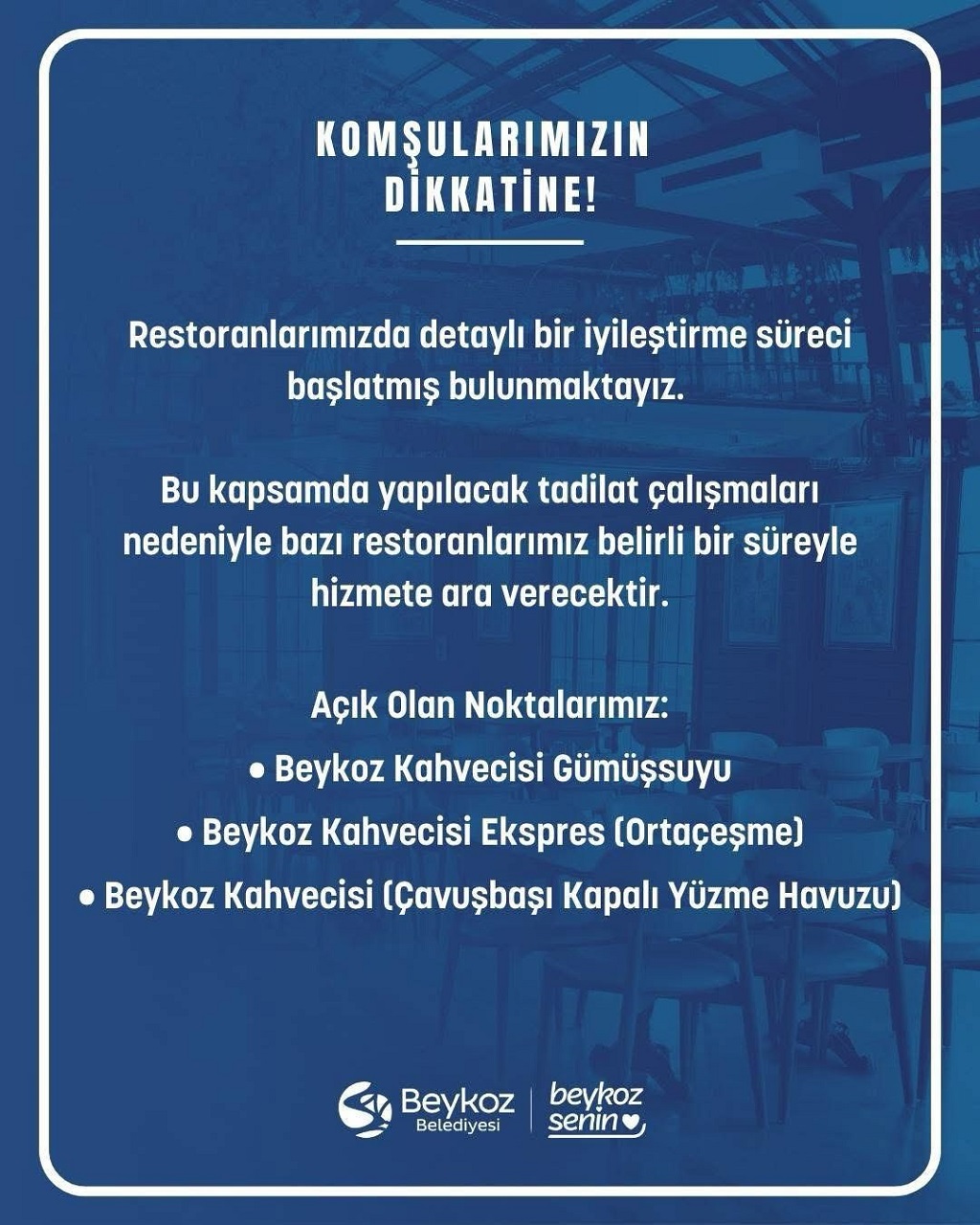 Beykoz Belediyesi, sosyal medya hesaplarından yaptığı duyuruyla bütün sosyal tesis restoranların tadilat çalışmaları nedeniyle hizmete ara verdiğini açıkladı.