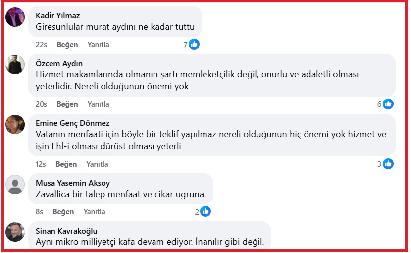 Özcem Aydın da, “Hizmet makamlarını olmanın şartı memlekette, onurlu ve adaletli olmasıdır. Nereli olduğunun önemi yok.” sözleriyle açıklamayı eleştirdi.