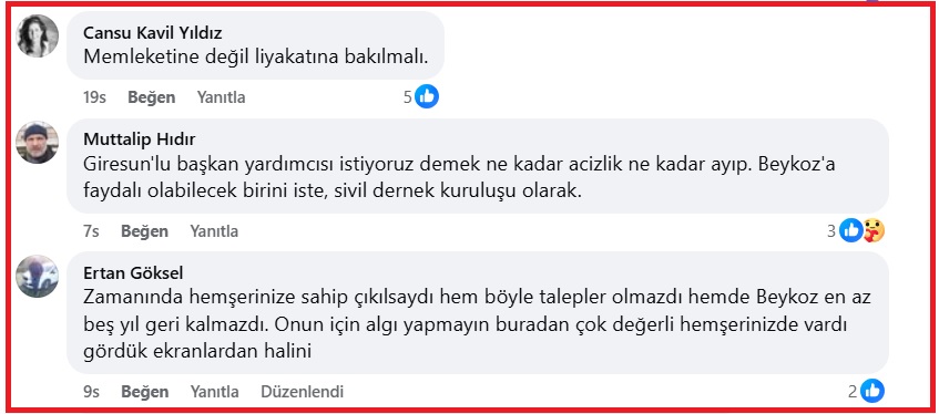 Beykozlu Giresunlular Derneği Başkanı Hayrullah Usta’nın Giresunlu başkan yardımcısı talebi vatandaşlardan büyük tepki topladı.