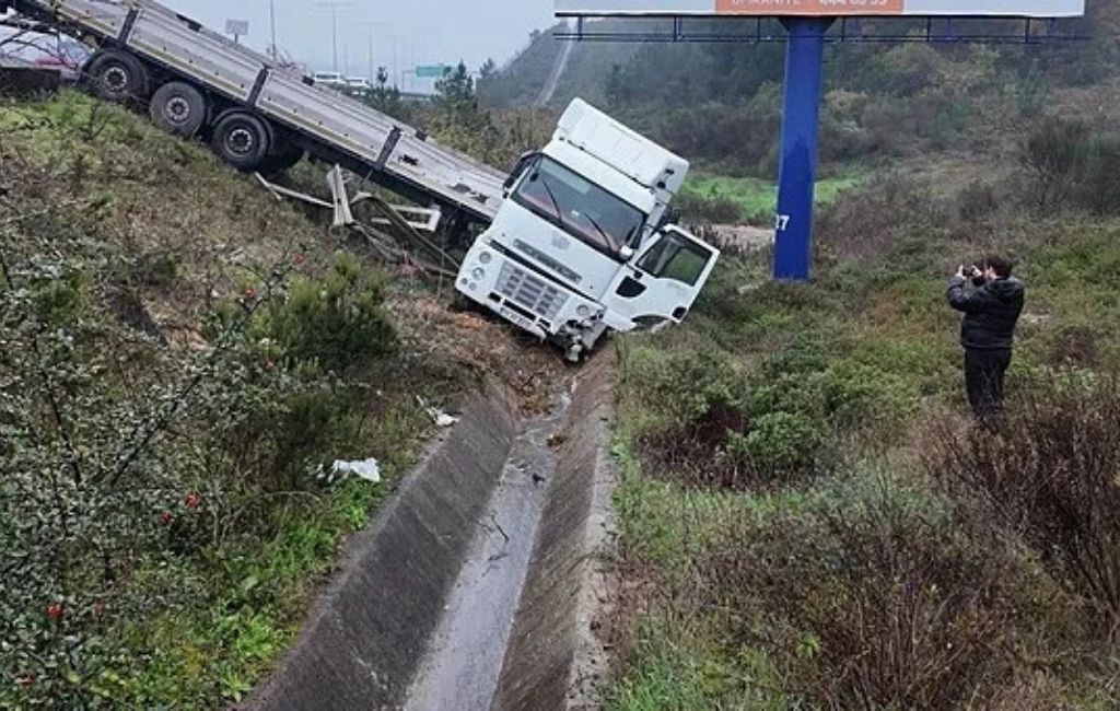 O.Ö. yönetimindeki tır, yağış nedeniyle sürücünün direksiyon hakimiyetini kaybetmesi sonucu bariyerleri aşarak şarampole devrildi.