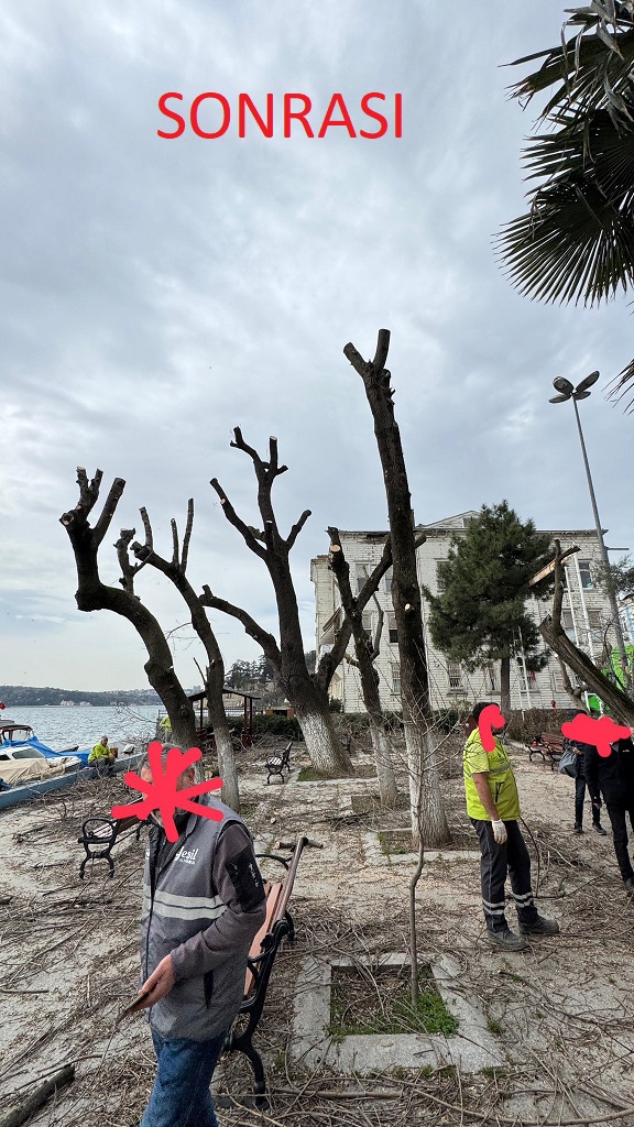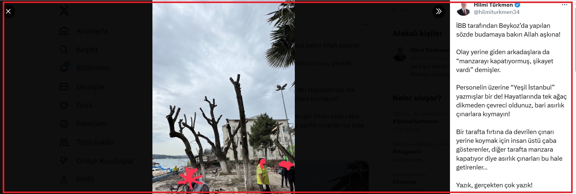 Türkmen, yapılan budamayı eleştirerek, “İBB tarafından Beykoz’da yapılan sözde budamaya bakın Allah aşkına! Olay yerine giden arkadaşlara da ‘manzarayı kapatıyormuş, şikâyet vardı’ demişler.” ifadelerini kullandı.
