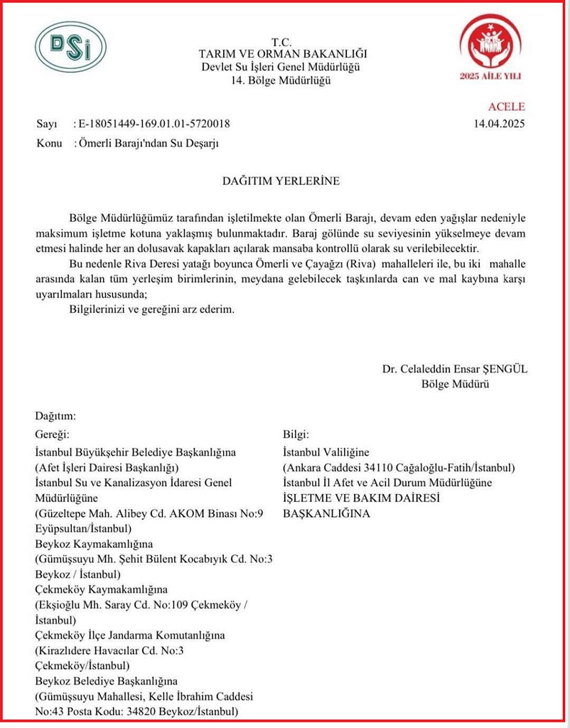 DSİ, olası su tahliyesiyle birlikte meydana gelebilecek taşkınlarda can ve mal kaybının önlenmesi için tüm yerleşim birimlerinin uyarılması gerektiğini belirtti. İstanbul Valiliği, İstanbul Büyükşehir Belediyesi, Beykoz Kaymakamlığı ve Beykoz Belediyesi’ne gönderilen resmi yazıda gerekli önlemlerin alınması istendi.