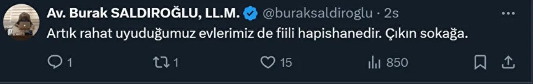 Skandal paylaşımları bununla da sınırlı kalmayıp o dönem “Artık rahat uyuduğumuz evlerimiz de fiili hapishanedir. Çıkın sokağa.”