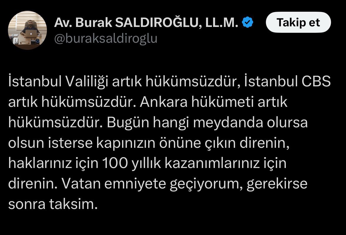 Ekrem İmamoğlu’nun yolsuzluk ve terör soruşturması kapsamında gözaltına alınmasının ardından, sosyal medya hesabından paylaşım yapan Saldıroğlu; “İstanbul Valiliği artık hükümsüzdür, İstanbul CBS artık hükümsüzdür. Ankara hükümeti artık hükümsüzdür. Bugün hangi meydanda olursa olsun isterse kapınızın önüne çıkın direnin, haklarınız için 100 yıllık kazanımlarınız için direnin. Vatan emniyete geçiyorum, gerekirse sonra taksim.” İfadelerini kullanmıştı.