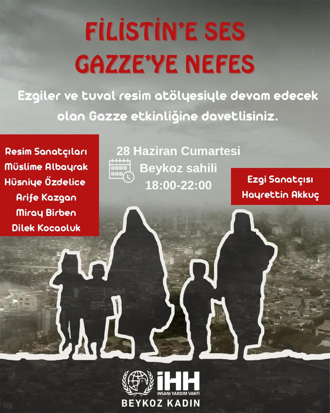 “Filistin’e Ses, Gazze’ye Nefes” sloganıyla düzenlenecek olan etkinlik, 28 Haziran Cumartesi günü saat 18.00-22.00 arasında Beykoz sahilinde gerçekleştirilecek.