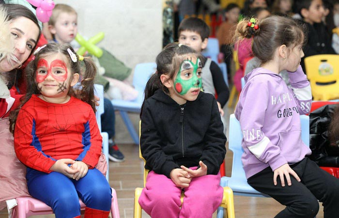 Kendileri için hazırlanan jonglor gösterisini de merakla izleyen çocuklar zaman zaman animatörlere eşlik ediyor.