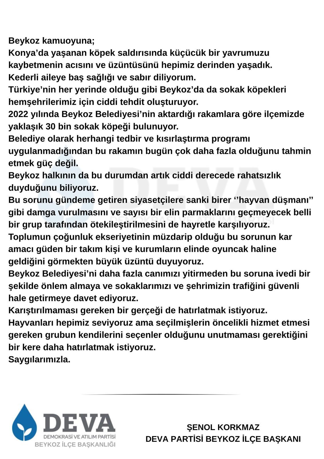 DEVA Partisi Beykoz İlçe Başkanı Şenol Korkmaz, ilçedeki başıboş köpek sorunun değindi. Korkmaz, Beykoz Belediyesine çağrı yaparak bu soruna ivedi bir şekilde çözüm üreterek güvenliği sağlaması gerektiğini vurguladı.