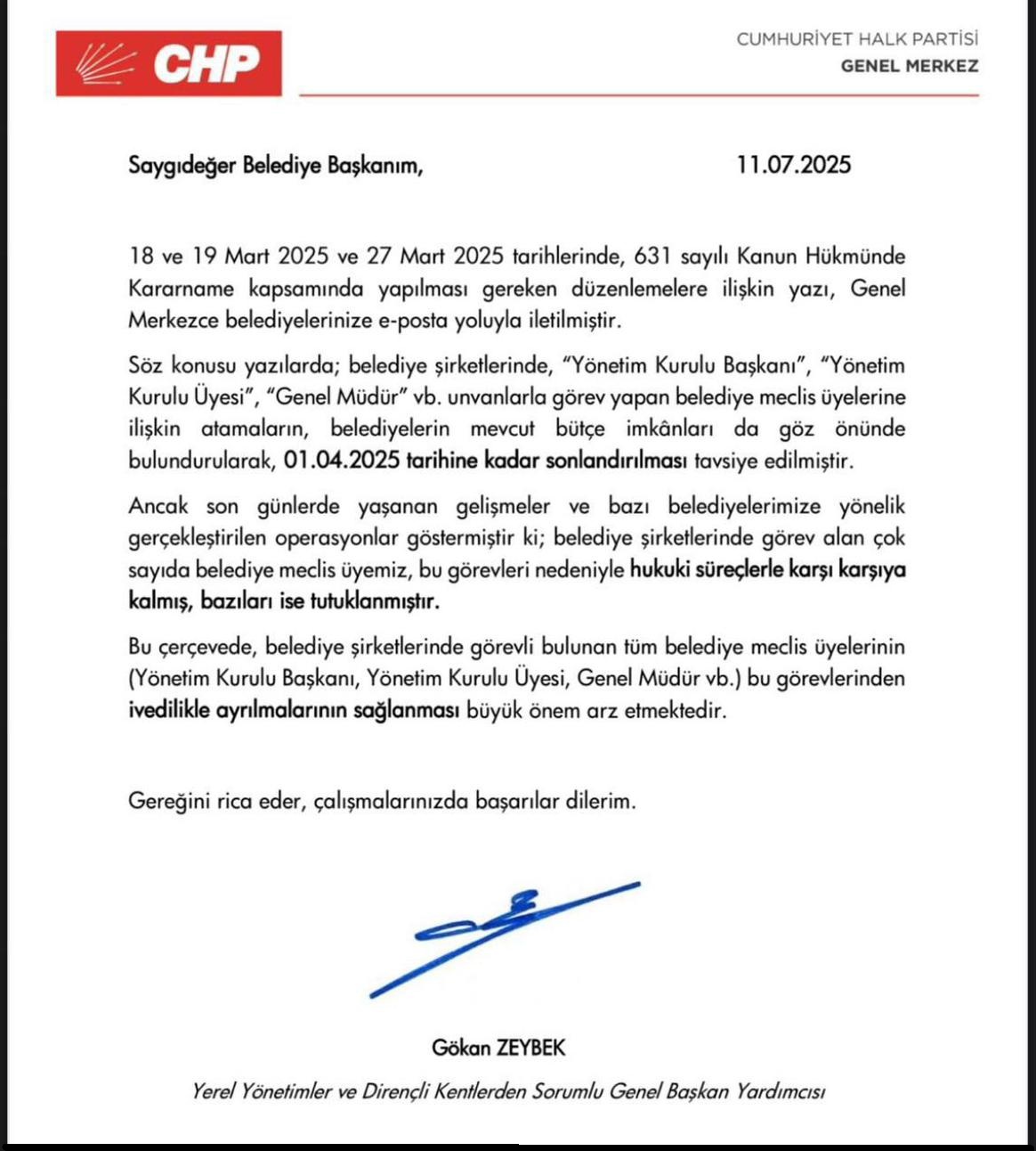 CHP Genel Merkezi tarafından yayınlanan genelgeyle, belediye meclis üyelerinin belediye şirketlerinde görev alması yasaklanmıştı.