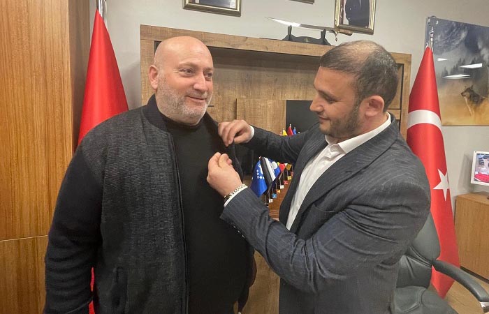 Yeni üyelere makamında rozet takan Çömlekçi, hatıra fotoğrafı çektirmeyi de ihmal etmedi.