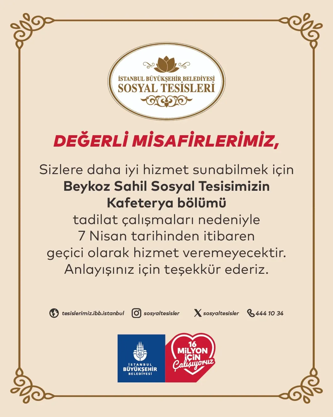 İBB tarafından yapılan açıklamada, “Sizlere daha iyi hizmet sunabilmek için Beykoz Sahil Sosyal Tesisimizin Kafeterya bölümü tadilat çalışmaları nedeniyle 7 Nisan tarihinden itibaren geçici olarak hizmet veremeyecektir” denildi.
