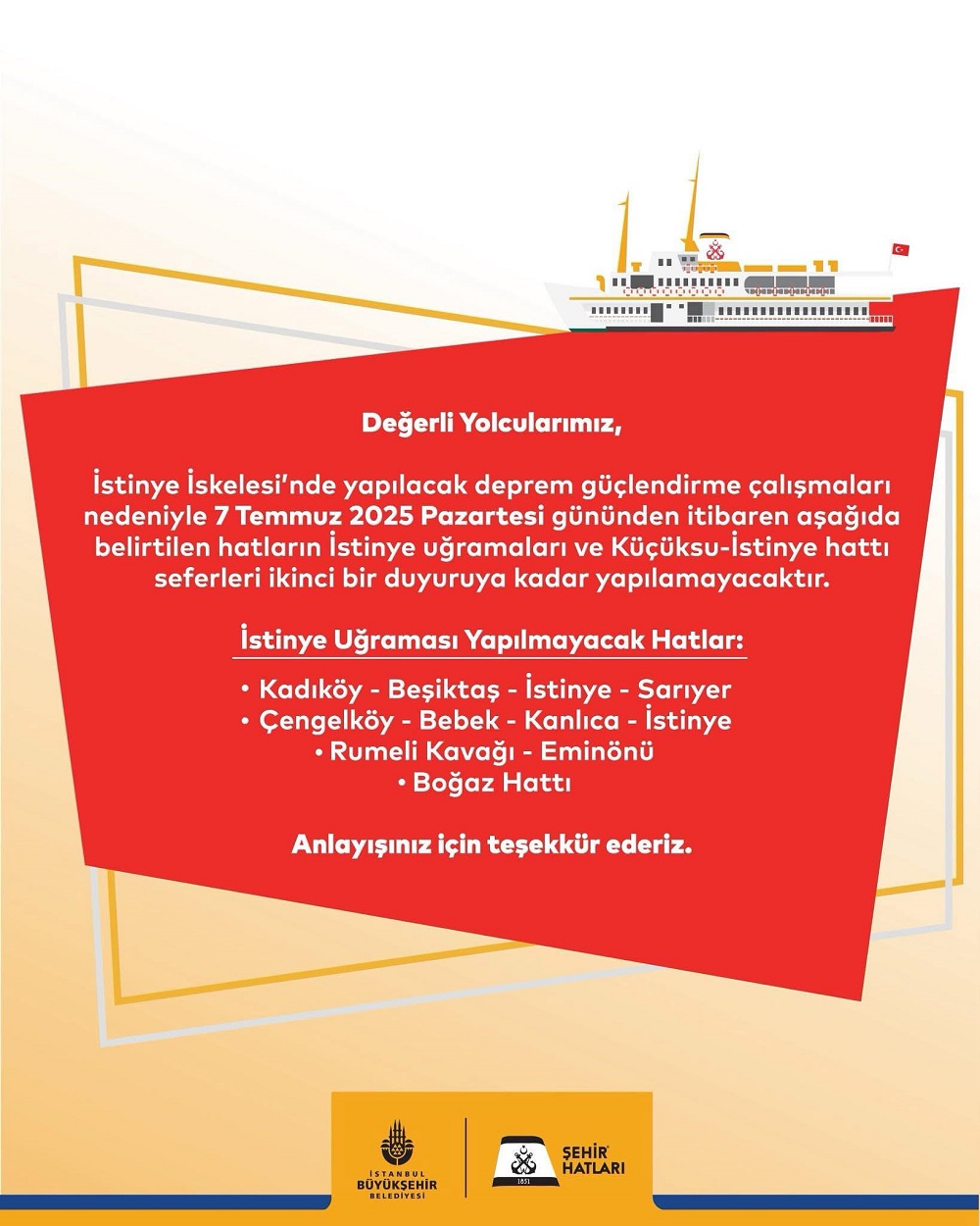 Yapılan açıklamaya göre, İstinye İskelesi’nde başlatılacak deprem güçlendirme çalışmaları nedeniyle 7 Temmuz 2025 Pazartesi gününden itibaren birçok hattın İstinye uğraması geçici olarak iptal edildi.