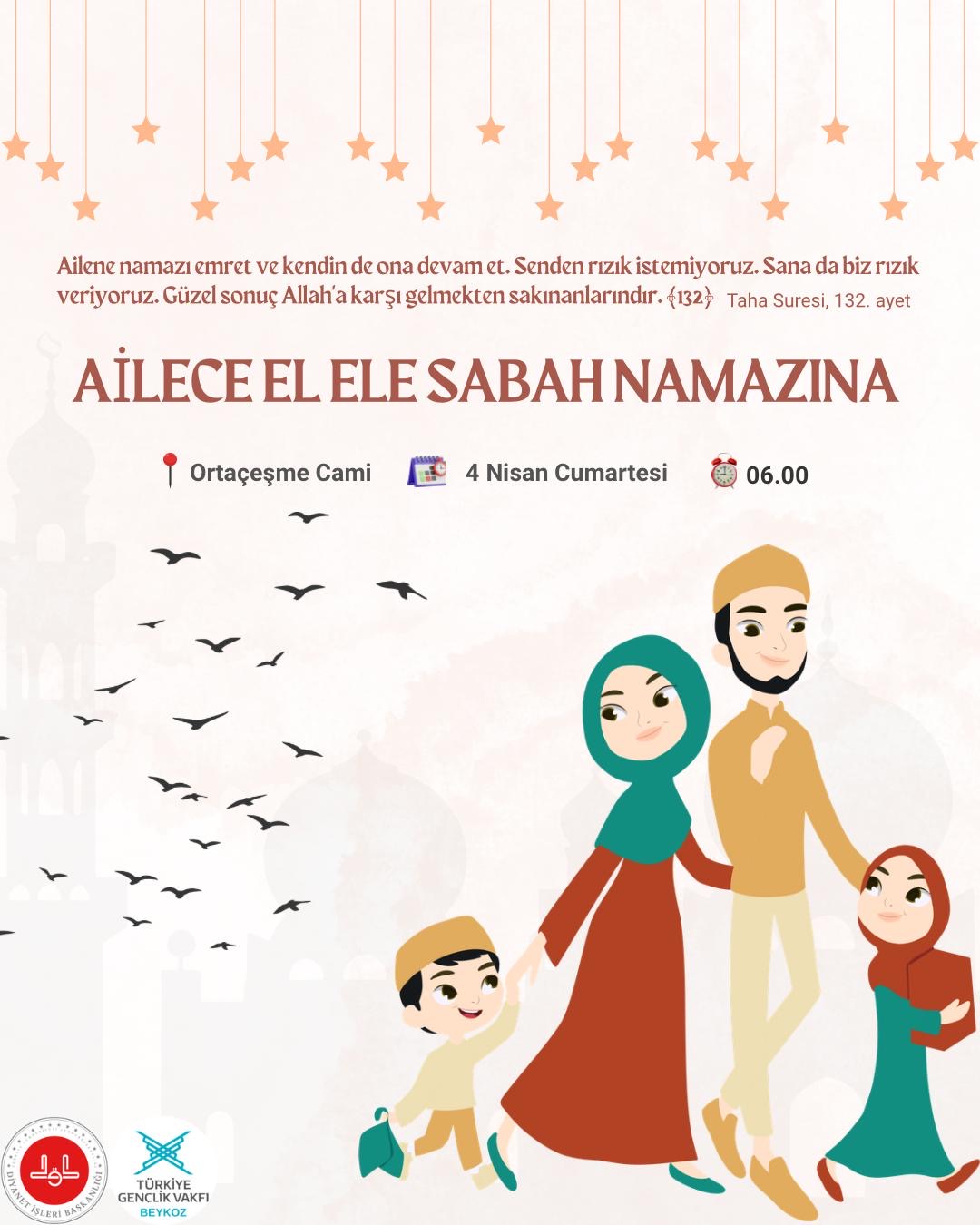 “Ailece El Ele Sabah Namazına” etkinliği, 4 Nisan Cumartesi günü saat 06.00’da Ortaçeşme Camii’nde aileler sabah namazında aynı safta buluşturacak.