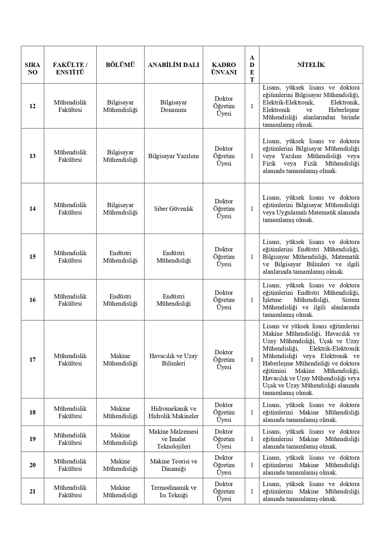 Başvuru Adresi: Profesör ve Doçent kadrosu için Personel Daire Başkanlığı, Doktor Öğretim Üyesi kadroları için Hukuk, Kültür ve Sosyal Bilimler ve Mühendislik Fakülteleri Dekanlıkları.