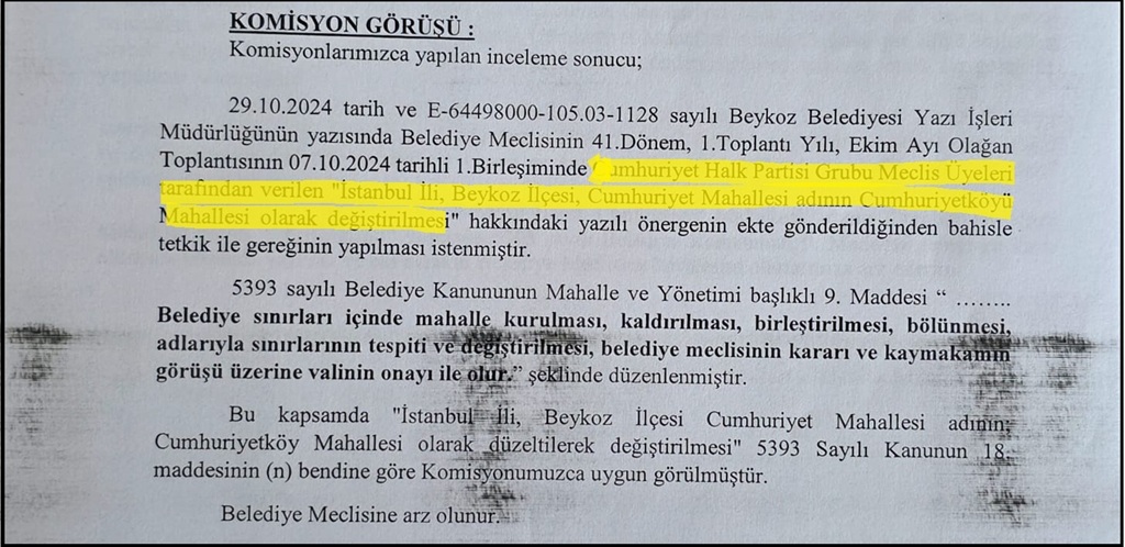 CHP Beykoz Meclis Üyeleri tarafından verilen önerge ile Türkiye’de ilk ve tek olan “Cumhuriyet” isimli mahalle adının ‘Cumhuriyetköy Mahallesi’ olarak değiştirilmesi hakkındaki Emlak ve istimlak Müdürlüğünün teklifi oy birliğiyle kabul edildi.
