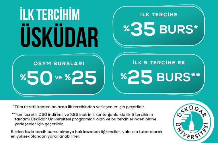 ÖSYM tarafından Üsküdar Üniversitesi tam ücretli lisans ve ön lisans programlarına kayıt yaptıran öğrencilerden, Üniversitemiz bölümlerinden birine ilk tercihinden yerleşenlere % 35, İkinci tercihinden yerleşenlere % 15; üçüncü, dördüncü ve beşinci tercihlerinden yerleşenlere % 10 indirim uygulanır.